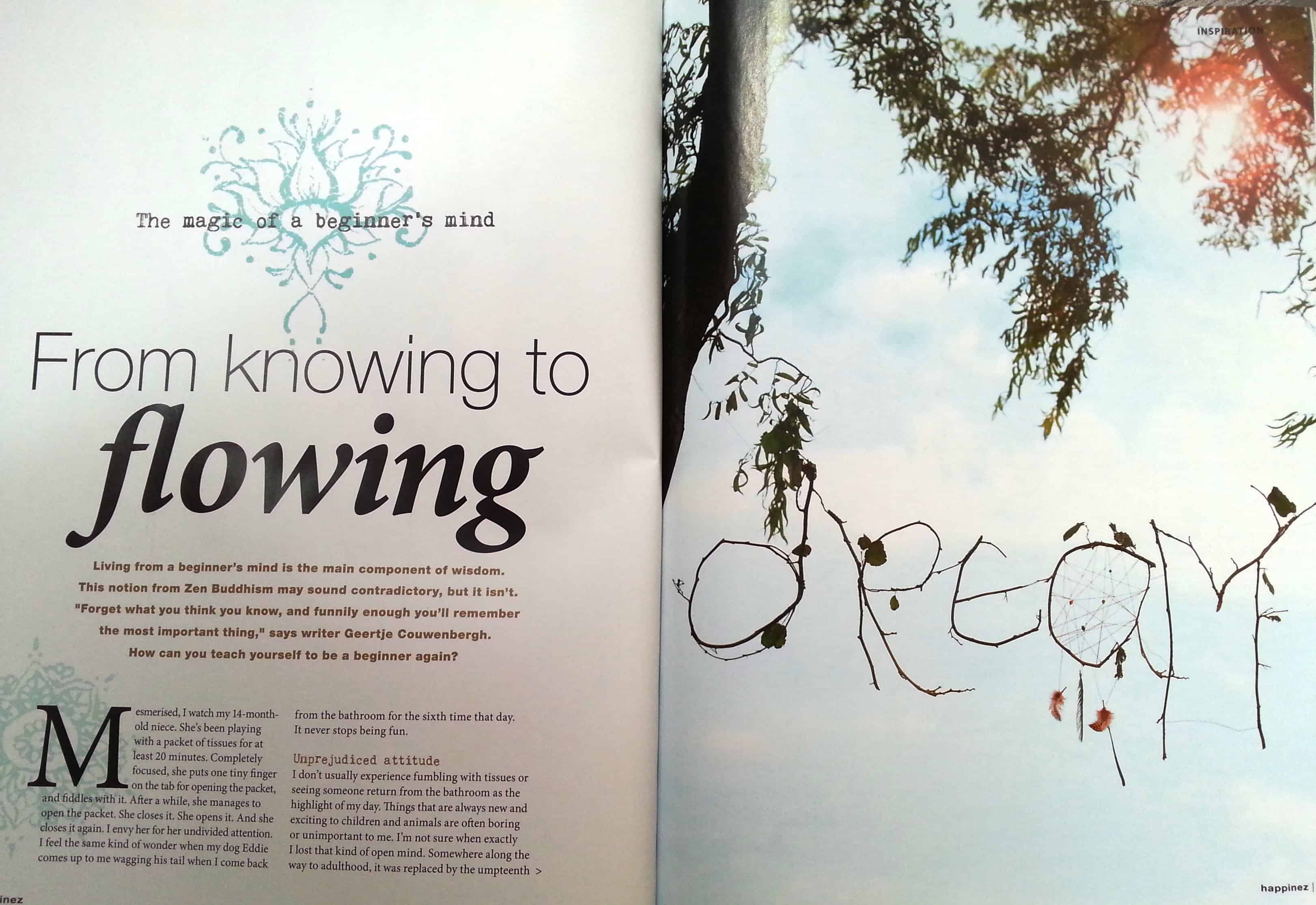 It’s wonderful to see some of the articles I originally wrote for Happinez magazine appear in their English, French and German editions! Like this one, on Beginners’s Mind/ L’ésprit Neuf